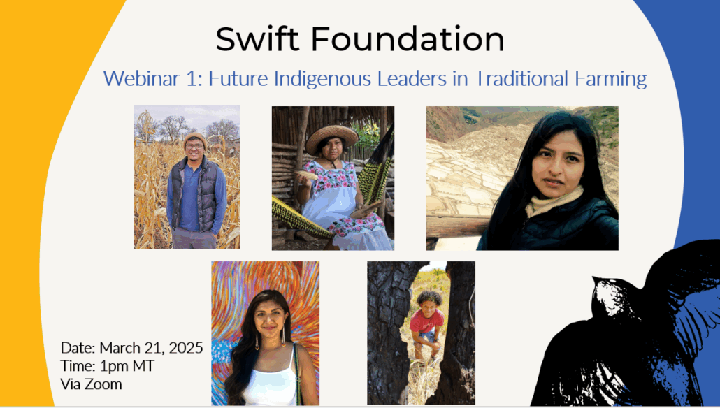 The June 4, 2025, webinar was moderated by Swift Foundation Executive Director Suzanne Benally, a member of the Navajo Nation with a 45-year distinguished career in philanthropy, cultural preservation, and higher education. Spanish language translation was provided by Cassandra Smith. Alejandro Argumendo, an Indigenous Quechua man from central Peru and Swift’s director of Programs and Amazon lead, gave closing remarks. The five dynamic panelists represent communities from two Pueblo tribes in New Mexico (United States), the Yucatan Peninsula in Mexico, and Indigenous groups in Columbia and Peru. Their captivating messages and photos describe time-honored Indigenous techniques that foster local ecosystem preservation and empower communities to collectively thrive sustainably for centuries.